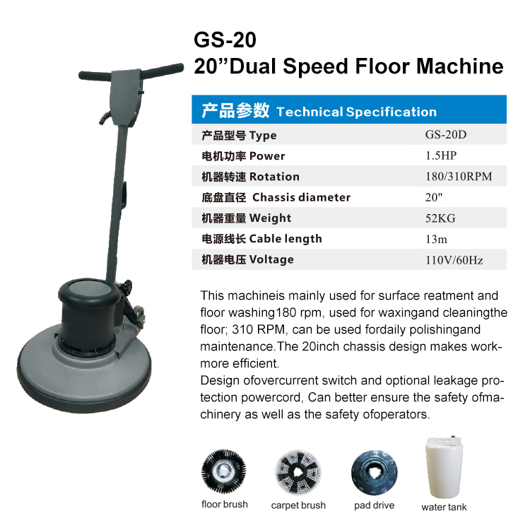 Switch con dispositivo de seguridad, el cual evita el arranque accidental de la máquina – Incluye tanque de solución para detergente, portapad,cepillo duro, ideales para lavado de pisos y para abrillantar pisos.